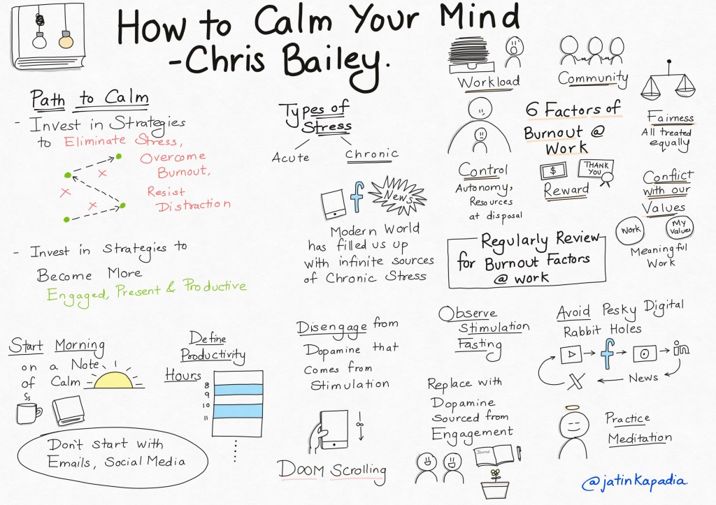 A topic that today’s young generation should be absolutely aware of is how the current age of cellphones and digital tablet is slowly inducing stress. Chris Bailey’s How to Calm your mind throws important light on the subject. It’s an absolute must read to understand the types of stress and habits to inculcate to avoid stress and improve mental calm. I keep reviewing this SketchNote regularly for the tips shared by Chris.